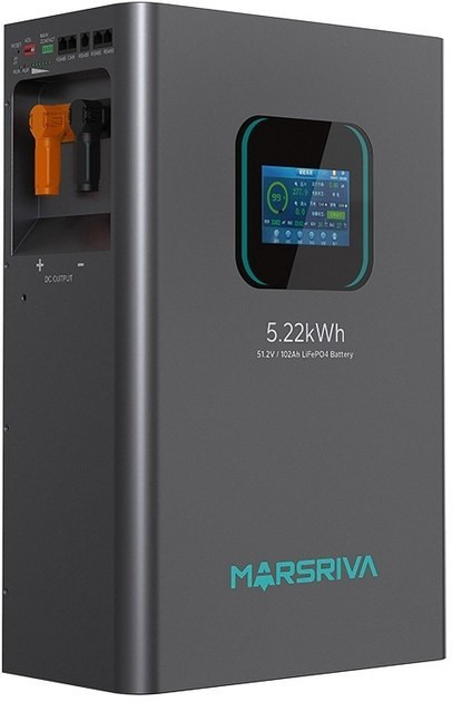 باتری لیتیومی Marsriva 5.22 kWh (LiFePO₄)، با سلولهای BYD گرید A، دوام بالا (حداقل ۶۰۰۰ چرخه) و بیش از ۱۰ سال عمر مفید، مجهز به BMS داخلی، صفحه نمایش لمسی و قابلیت اتصال موازی تا ۱۵ واحد است. بدنهای مقاوم، نصب آسان (زمینی/دیواری) و ارتباط با سیستمهای کنترل از مزایای دیگر آن است